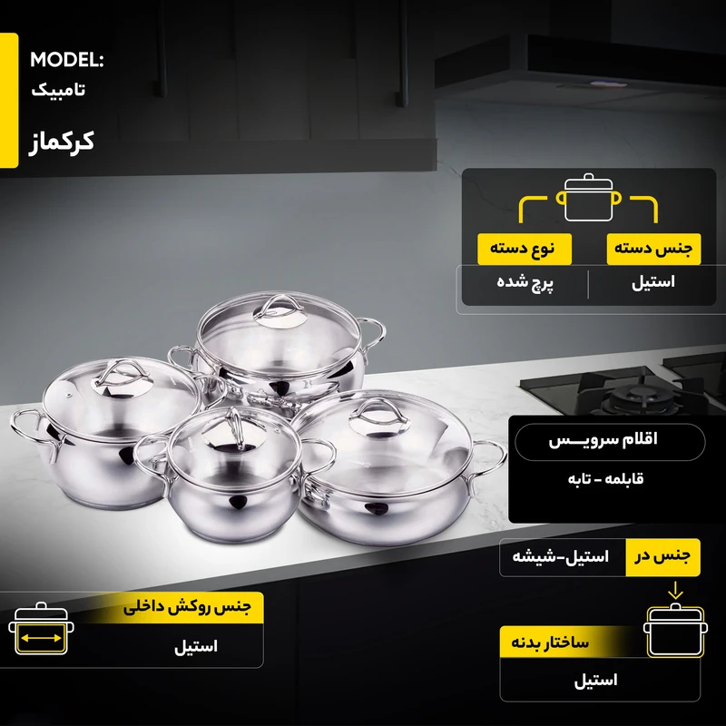 سرویس قابلمه استیل ۹ پارچه کرکماز مدل تامبیک ۱۸۰۰، یکی از نمادینترین و محبوبترین طراحیهای این برند ترکیهای است. نام “تامبیک” در زبان ترکی به معنای “تپل و شکمدار” است که دقیقاً به طراحی منحنی و کلاسیک این سرویس اشاره دارد.
