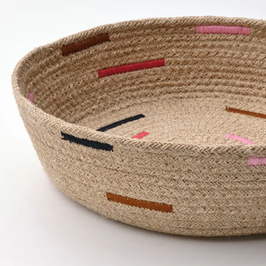 این سبد بزرگ از جوت بافته شده، هم زیباست و هم کاربردی. جزئیات گلدوزی رنگارنگ آن جلوهای شاد دارد و برای نگهداری وسایل در راهرو، آشپزخانه یا نشیمن عالی است.