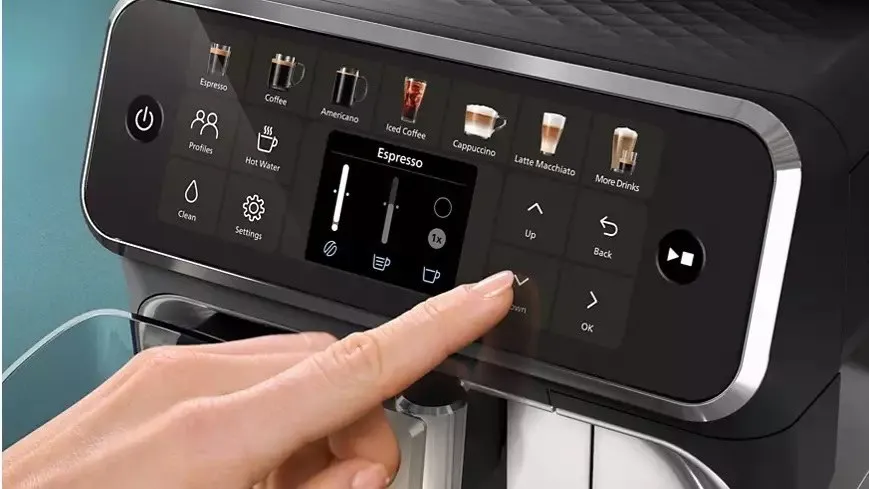 از ظاهر دستگاه و پنل لمسی میتوان متوجه شد با یک دستگاه مدرن از فیلیپس روبرو هستیم. زیبایی کار با تصاویری از نوشیدنیهای موردنیازتان روی منو، تکمیل شده است. این کار البته برای انتخاب آسانتر منو انجام شده ولی خب زیبایی بصری هم به کار میبخشد.