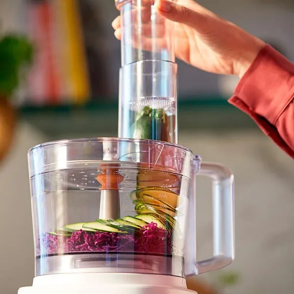 قبل از اینکه بخواهید مواد را داخل کاسه خردکن بریزید، نیاز نیست تا زمان زیادی صرف ریز کردن آنها کنید. این مواد با حالت تقریباً درشت اما نه زیاد هم قابل ردشدن از دهانه کاسه هستند. این نوع طراحی دهانه میتواند زمان شما را برای کارهای مهمتر دیگری ذخیره نماید.
