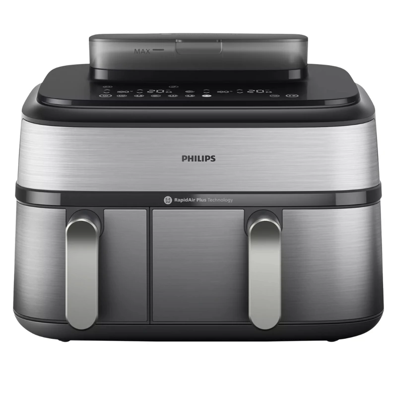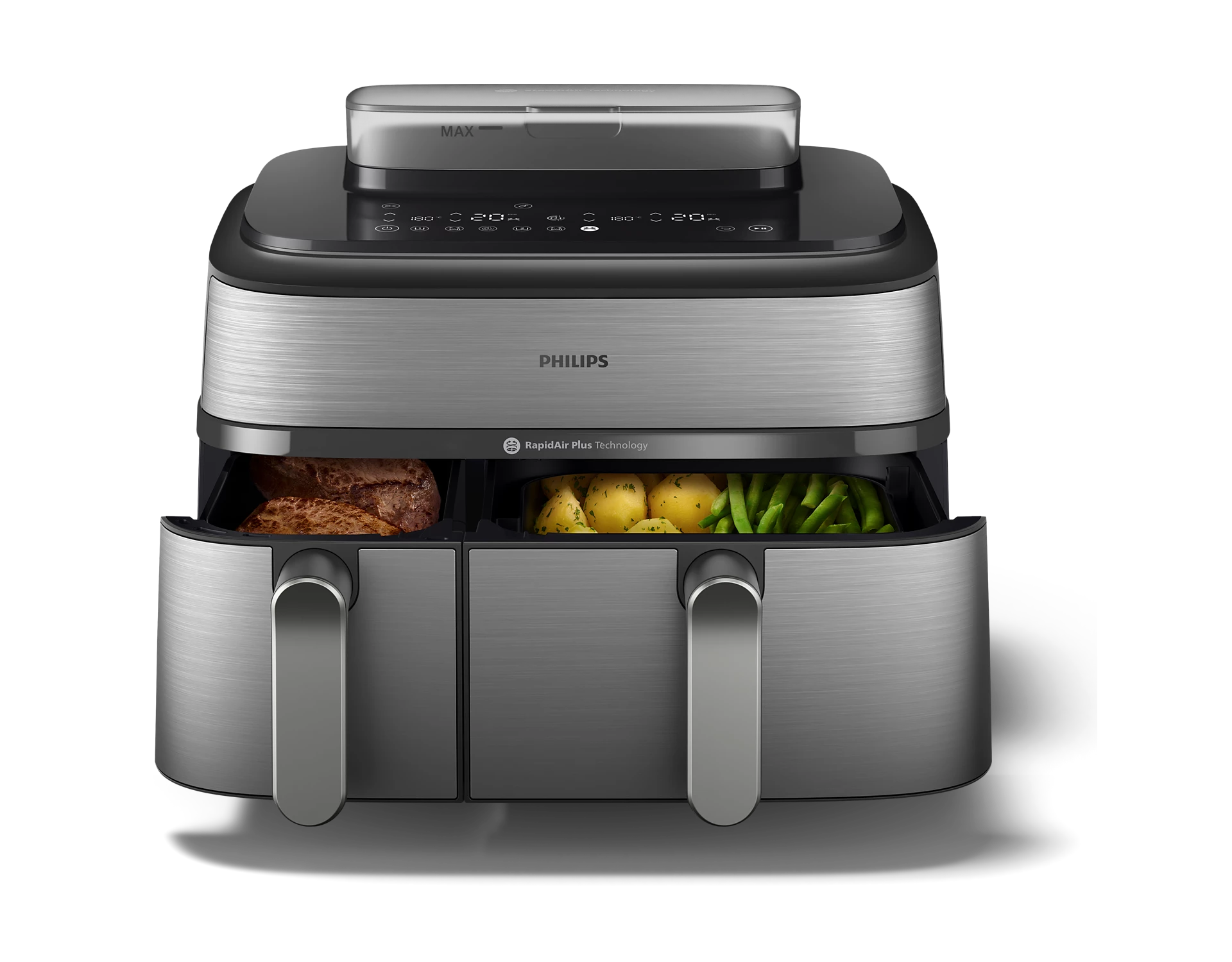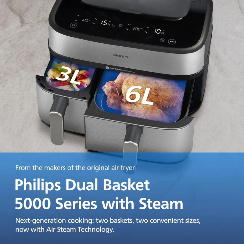 سرخ کن بدون روغن فیلیپس مدل NA555/09 ظرفیت ۹ لیتری، با طراحی دو سبد، برای خانوادههای متوسط تا بزرگ عالی عمل میکند. علاوه بر سرخکردن با هوای داغ، قابلیت بخارپز نیز دارد، یعنی میتوانید از آن برای تهیه سبزیجات، ماهی، دیمسام یا بخارپز غذاهایی که نیاز به لطافت دارند، استفاده کنید.