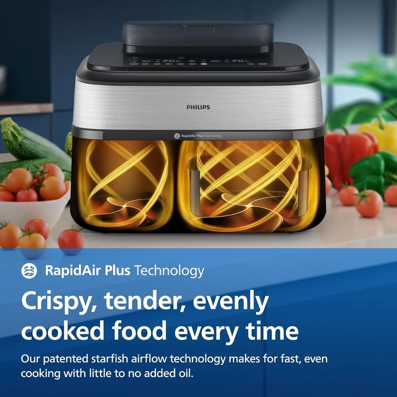 یک سبد این ایر فرایر ۶ لیتر و دیگری ۳ لیتر حجم دارد. به کمک فناوری گردش هوای داغ درون دستگاه، این سرخ کن بدون روغن با این جریان غذای شما را سرخ میکند و یا آن را میپزد. این بستگی به مدل انتخابی شما بر روی منوی دستگاه دارد. با این کارتان غذایی دارید که کمتر از ۱۰٪ روغن دارد.