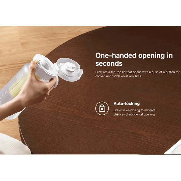 کافی است تا با یکدست قمقمه را نگهدارید و با یک انگشت به درب آن فشار وارد کنید تا دکمه باعث بازشدن درب اصلی شود. در این صورت شما تنها به کمک یکدستتان آب را مینوشید. این ویژگی برای زمانی که در حال فعالیت ورزشی مانند دوچرخهسواری هستید و هر دو دست شما نباید مشغول کار دیگری باشد، عالی است.
